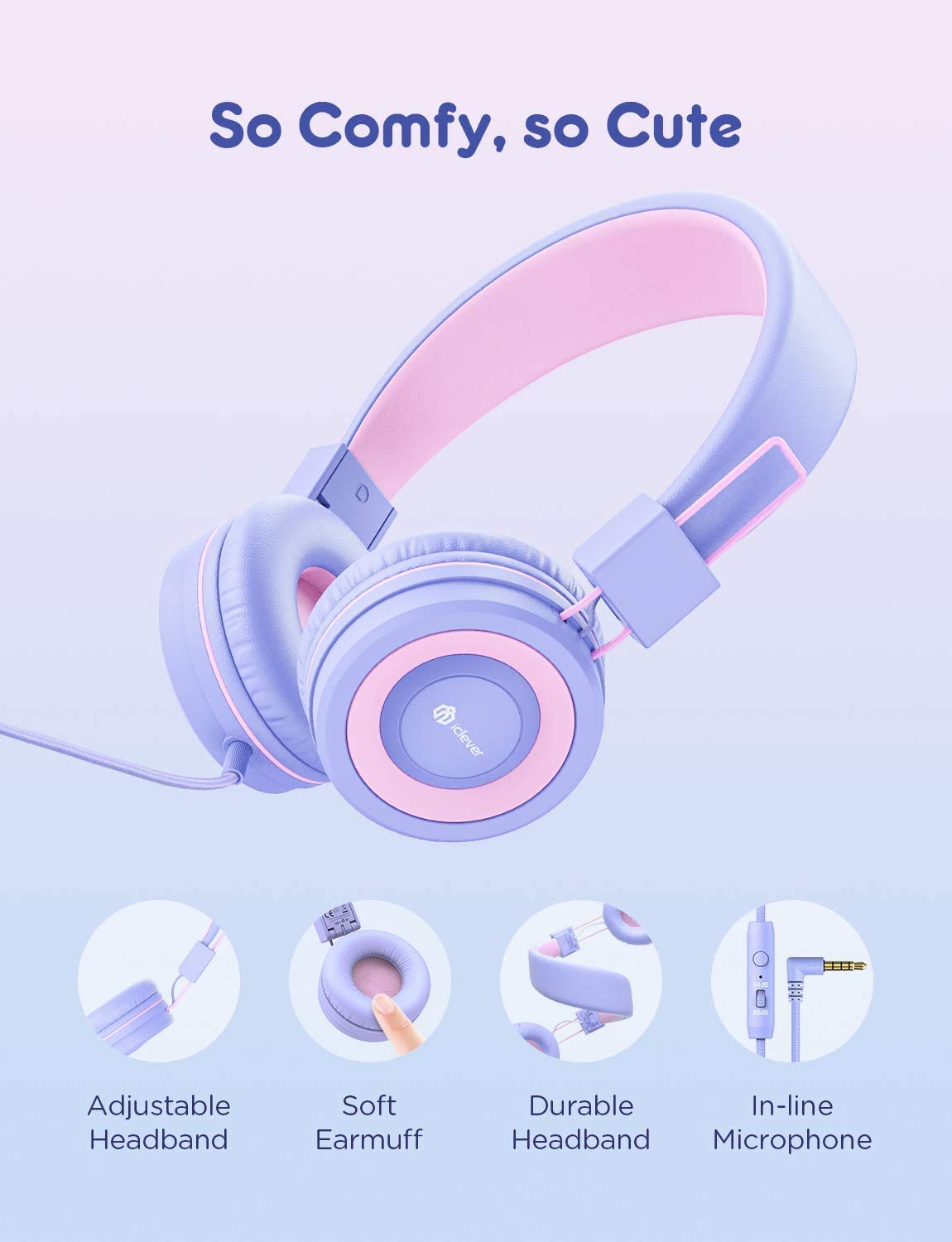 Ein weiterer Pluspunkt ist das verstellbare und robuste Kopfband, das sich verschiedenen Kopfgrößen anpasst und sowohl haltbar als auch flexibel ist. Das verbesserte Kabel aus hochwertigem Nylongewebe ist stark und widerstandsfähig gegen Ziehen und Reiben. Der iClever Kinderkopfhörer ist auch faltbar, was ihn bequem zu tragen und zu lagern macht.