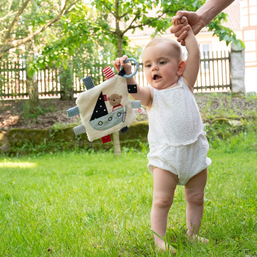 Es ist nicht nur niedlich, sondern auch ein praktisches Motorikspielzeug. Das Knistertuch Teddy aus der Ocean Club Kollektion wird mit einem Befestigungsring geliefert und kann einfach per Hand gewaschen werden.